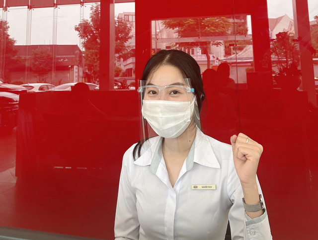 Nụ cười thể hiện rõ qua ánh mắt của chị Nguyễn Thị Ni, TVBH KIA Gò Vấp khi chị được đi làm lại từ ngày 1/10. Chị Ni cho biết: “Khi nhận được thông báo đi làm, tôi dành cả một ngày trước đó để nhắn tin và thông báo đến những khách hàng thân thiết là mình đã trở lại showroom và sẵn sàng hỗ trợ họ. Tôi háo hức đến mức không ngủ được vì sắp được gặp lại các anh chị quản lý, đồng nghiệp và trở lại công việc thường nhật. Trong ngày đầu tiên đi làm, tôi được công ty thực hiện test nhanh, khai báo y tế và đo thân nhiệt đầy đủ. Sau đó tôi vệ sinh lại các khu vực làm việc, đón khách, trưng bày và khu vực lái thử xe. Tôi chủ động tuân thủ 5K, đeo khẩu trang, kính chắn giọt và đảm bảo khoảng cách khi gặp gỡ khách hàng”.