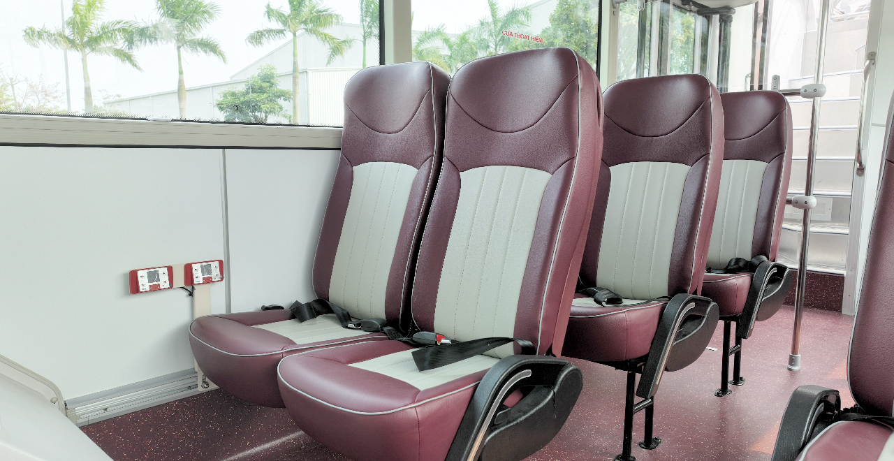 Tầng dưới là khoang khép kín với 12 chỗ ngồi, 4 chỗ đứng, 01 chỗ xe lăn và có trang bị dây đai an toàn 2 điểm cùng các tính năng khác như sạc USB, bệ tựa tay, túi đựng đồ.